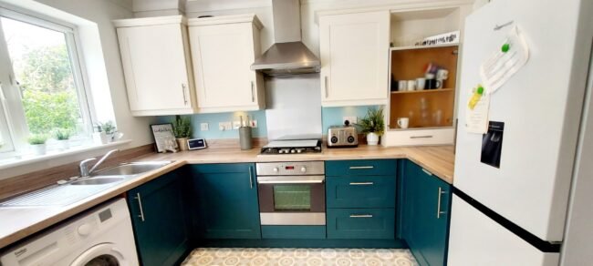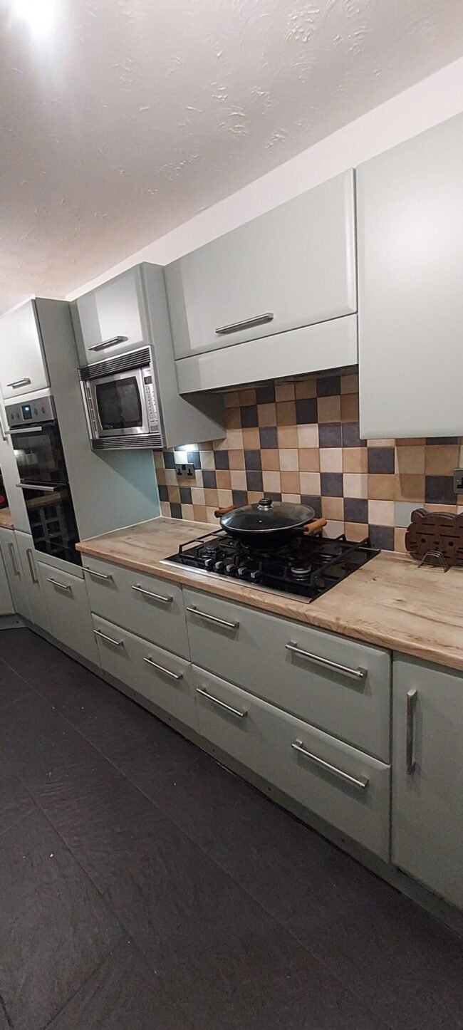 BEFORE The dark worktops had seen better days and needed some TLC. The door fronts had also started to come away so we replaced these and made some light repairs to the carcasses AFTER Once the doors and tops had been replaced, our customer chose pastel green / oak vinyl to create a new country…